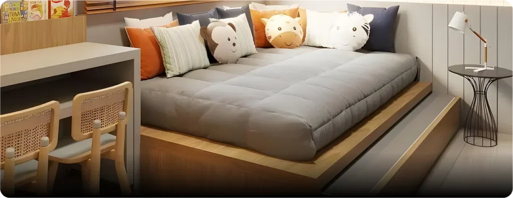 Clutter makes any small bedroom feel smaller. So it’s important to give everything a place. Under-bed storage, ottomans with hidden compartments, or built-in wardrobes work really well. Baskets and trays can help organise little things like books or accessories. Keeping the room neat shows how you can save space in a small bedroom without losing comfort.